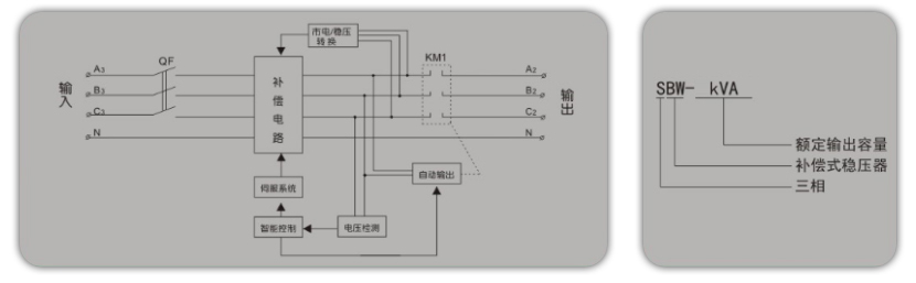 工作原理圖: 產(chǎn)品概述: 三相全自動(dòng)補(bǔ)償式電力穩(wěn)壓器是適用于當(dāng)外界的供電網(wǎng)絡(luò)電壓波動(dòng)或負(fù)載變化而造成電壓波動(dòng)時(shí),能自動(dòng)保持輸出電壓穩(wěn)定。本系列產(chǎn)品與其它型式的穩(wěn)壓器相比,具有容量大、效率高、無(wú)波形畸變、電壓調(diào)節(jié)平穩(wěn)等優(yōu)點(diǎn),適用負(fù)載廣泛,能承受瞬時(shí)超載,可長(zhǎng)期連續(xù)工作,手動(dòng)/自動(dòng)切換,設(shè)有過(guò)壓保護(hù)、缺相、相序保護(hù)及機(jī)械故障自動(dòng)保護(hù),本機(jī)體積小,重量輕,使用安裝方便,運(yùn)行可靠等優(yōu)點(diǎn)。(分?jǐn)?shù)顯、儀表指示兩類) 廣泛運(yùn)用于隧道升壓工礦企業(yè)、印刷、機(jī)床、郵電、鐵路、建筑工地、學(xué)校、醫(yī)院、賓館、國(guó)防、科研等部門的電子計(jì)算機(jī)、精密機(jī)床、精密儀器、實(shí)驗(yàn)裝置、電梯及生產(chǎn)流水線的電源穩(wěn)壓中。升壓變壓器同時(shí)也適用于電源電壓低、波動(dòng)幅度大的低壓配電終端用戶及負(fù)載變動(dòng)較大的用電設(shè)備,如升降機(jī)、起重機(jī)、攪拌機(jī)等一切需要電壓穩(wěn)定的場(chǎng)所。技術(shù)參數(shù):![{UO]IHK}SBYN]K))QHY[QPS.jpg](upload/2019110575898625.jpg) 輸入電壓 | 單相220V±20%,三相四線線電壓380V±20%(可定制±30% ±40%) | 輸出電壓 | 單相220V 三相380V | 輸出精度 | ±1-5﹪(可調(diào)) | 頻率 | 50Hz/60Hz | 效率 | ≥98﹪(功率等級(jí)50KVA以上) | 響應(yīng)速度 | ≤1.5S | 環(huán)境溫度 | -10℃- + 40℃ | 絕緣電阻 | ≥ 2MΩ | 過(guò)載能力 | 二倍額定電流,維持一分鐘 | 波形失真 | 無(wú)附加波形失真 | 保護(hù)功能 | 過(guò)壓、欠壓、過(guò)流、缺相、相序、旁路 | 旁路 | 當(dāng)穩(wěn)壓器需要維護(hù)或穩(wěn)壓器出現(xiàn)故障時(shí)可手動(dòng)切入市電 | 適應(yīng)負(fù)載 | 阻性 容性 感性 | 控制系統(tǒng) | 機(jī)采用雙控制器系統(tǒng)控制,實(shí)現(xiàn)人性化設(shè)計(jì),能有效的減少對(duì)設(shè) 備的維護(hù)時(shí)間,可選擇人機(jī)界面 |