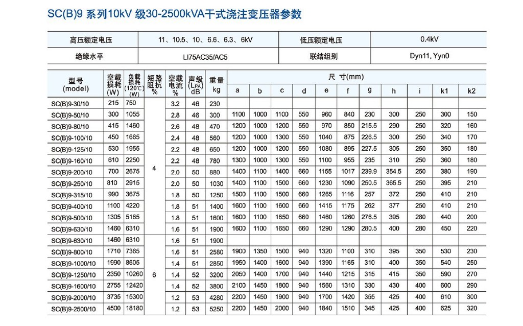 產(chǎn)品標(biāo)準(zhǔn)及規(guī)范 1、標(biāo)準(zhǔn):GB1094、GB6450-86、GB/T10228-1997、符合DIN42523、IEC726 2、容量范圍:30-16000kVA 3、電壓等級:10KV、35kV 4、調(diào)壓方式:無勵磁調(diào)壓或有載調(diào)壓 5、分接范圍:±5%、±2X 2.5%、±4X2.5% 6、頻率:50Hz或60Hz 7、相數(shù):三相或單相 8、聯(lián)結(jié)組標(biāo)號:Yyn0、Dyn11或其它 9、短路阻抗:標(biāo)準(zhǔn)阻抗 1O、海拔小于1000m,環(huán)境溫度低于40度,超過上述使用條件時,應(yīng)按照標(biāo)準(zhǔn)做相應(yīng)的定額調(diào)整 11、最高溫升:100K 12、冷卻方式:自冷(AN)或風(fēng)冷(AF) 13、防護(hù)等級:IP00,IP20,IP23 14、絕緣等級:F級 15、絕緣水平: SCB10-400KW500KW630W多少錢一臺¥什么價格?萬元 (1)10kV級產(chǎn)品工頻耐壓35kV,雷電沖擊電壓75kV (2)20 kV級產(chǎn)品工頻耐壓50kV,雷電沖擊電壓125kV (3)35kV級產(chǎn)品工頻耐壓70kV,雷電;中擊電壓170KV