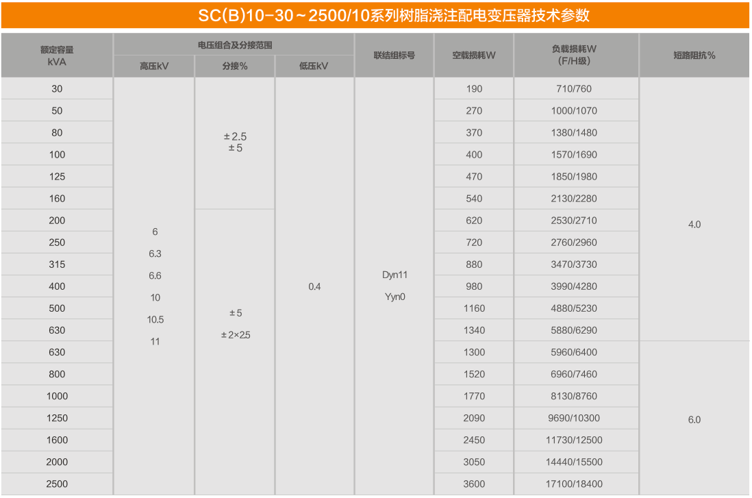產(chǎn)品特點干式變壓器250KVA315KVA400KVA500KVA630KVA800KVA1000KVA1250KVA1600KVA2000KVA2500KVA 安全:難燃防火,無污染,耐腐蝕性好,可直接安裝在負(fù)荷中心。 防潮:可在 濕度下正常運行。 免維護:安裝簡便,綜合運行成本低。 優(yōu)良性能:損耗低,局部放電量低,噪聲小,機械強度高,抗短路能力強,散熱能力強,強迫風(fēng)冷條件下可以130%額定負(fù)載運行。 溫控保障:配備有完善的溫度保護控制系統(tǒng),為變壓器安全運行提供可靠保障。據(jù)對已經(jīng)投入運行的產(chǎn)品的運行報告,產(chǎn)品的可靠性指標(biāo)已經(jīng)達(dá)到國際先進(jìn)水平。 使用條件• 海拔≤1000m,-25℃≤環(huán)境溫度≤40℃,戶內(nèi)式。對空氣自冷與強迫風(fēng)冷的變壓器,均需保證變壓器具有良好的通風(fēng)能力。當(dāng)變壓器安裝在地下室或其他通風(fēng)能力較差的環(huán)境,須增設(shè)散熱通風(fēng)裝置。保護等級有IP00、IP20、IP23等型式。 • 當(dāng)海拔>1000米時或是環(huán)境溫度大于40℃或者小于-25℃時,產(chǎn)品須按照GB1094.11《電力變壓器第11部分:干式變壓器》的要求對有關(guān)額定值作相應(yīng)調(diào)整。 技術(shù)參數(shù)