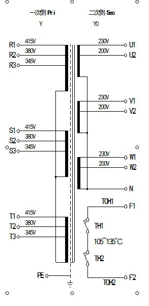 英施丹集團(tuán)GSG系列三相干式變壓器為SG的延伸產(chǎn)品,廣泛應(yīng)用于各類數(shù)控機(jī)床、加工中心、自動化控制、數(shù)控設(shè)備的伺服系統(tǒng)和主軸電機(jī)的電壓變換,及控制電源之用;可與發(fā)那科、西門子、松下、三菱、華中、凱恩帝、航天等數(shù)控伺服系統(tǒng)、伺服電機(jī)、主軸電機(jī)匹配使用。 連接示意圖